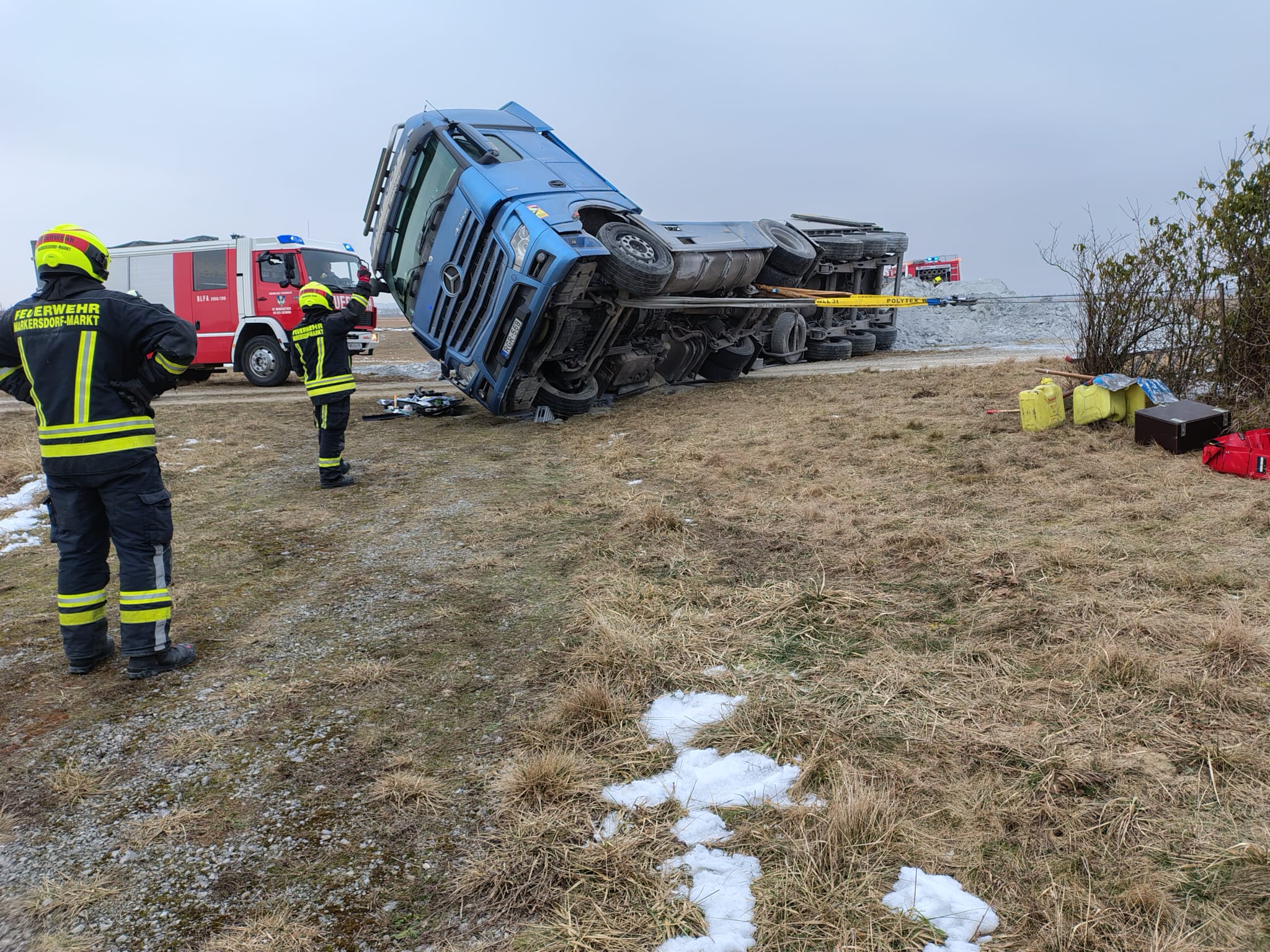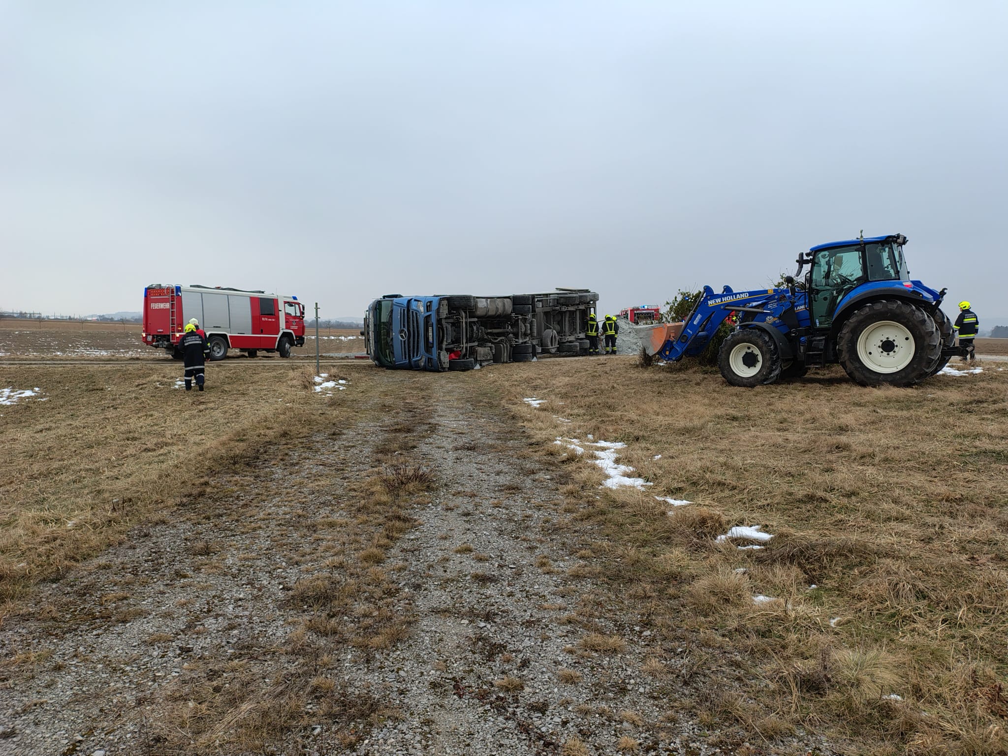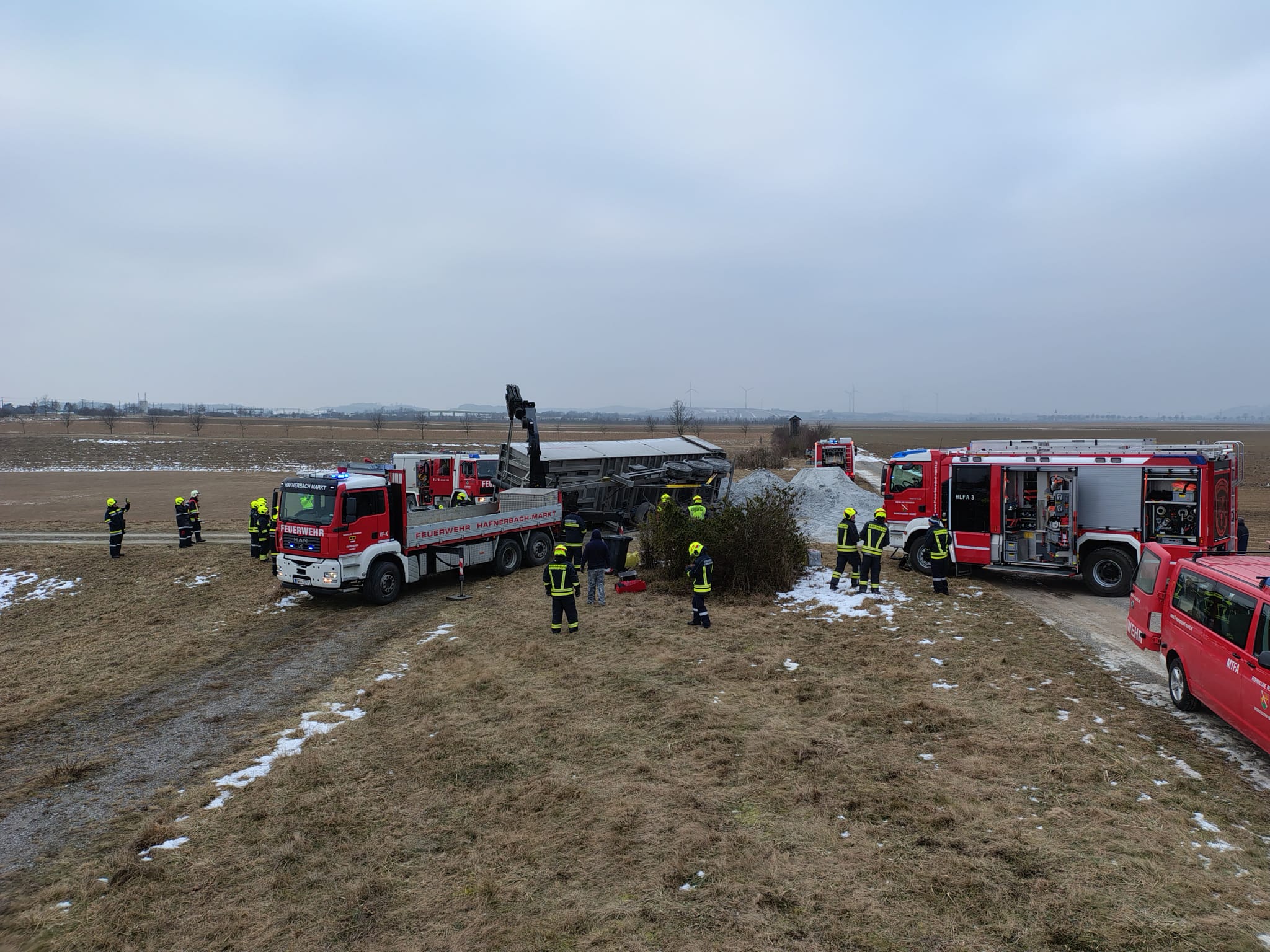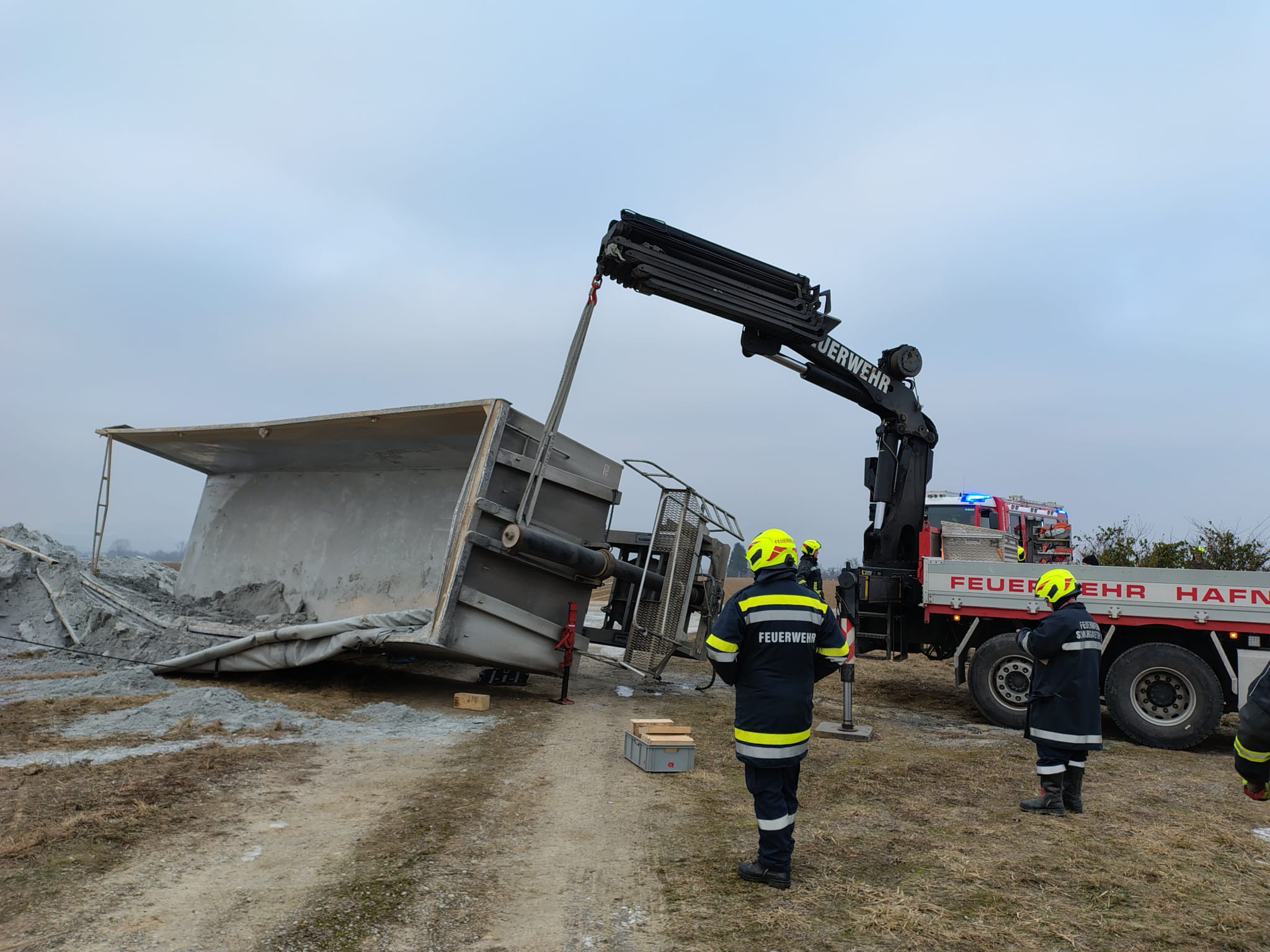 Am 22. Jänner um 14:02 kippte ein LKW beim Kalk abkippen aus unbekannter Ursache um. Gemeinsam mit der Feuerwehr Markersdorf und Hafnerbach sicherten wir den umgekippten LKW und stellten das Zugfahrzeug und den Hänger mittels Seilwinden und Kran wieder auf. Nach ca. 2h konnten wir wieder ins FF-Haus einrücken