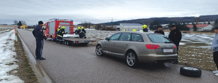 Am 22. Februar wurden wir zu einer PKW-Bergung alarmiert. Ein PKW verlor auf der Straße einen Reifen. Nach Absicherung der Unfallstelle und Freigabe durch die Polizei unterstützten wir den PKW-Lenker mit dem defekten Reifen. Anschließend konnten wir das Fahrzeug mittels Abschleppanhänger sicher abstellen.