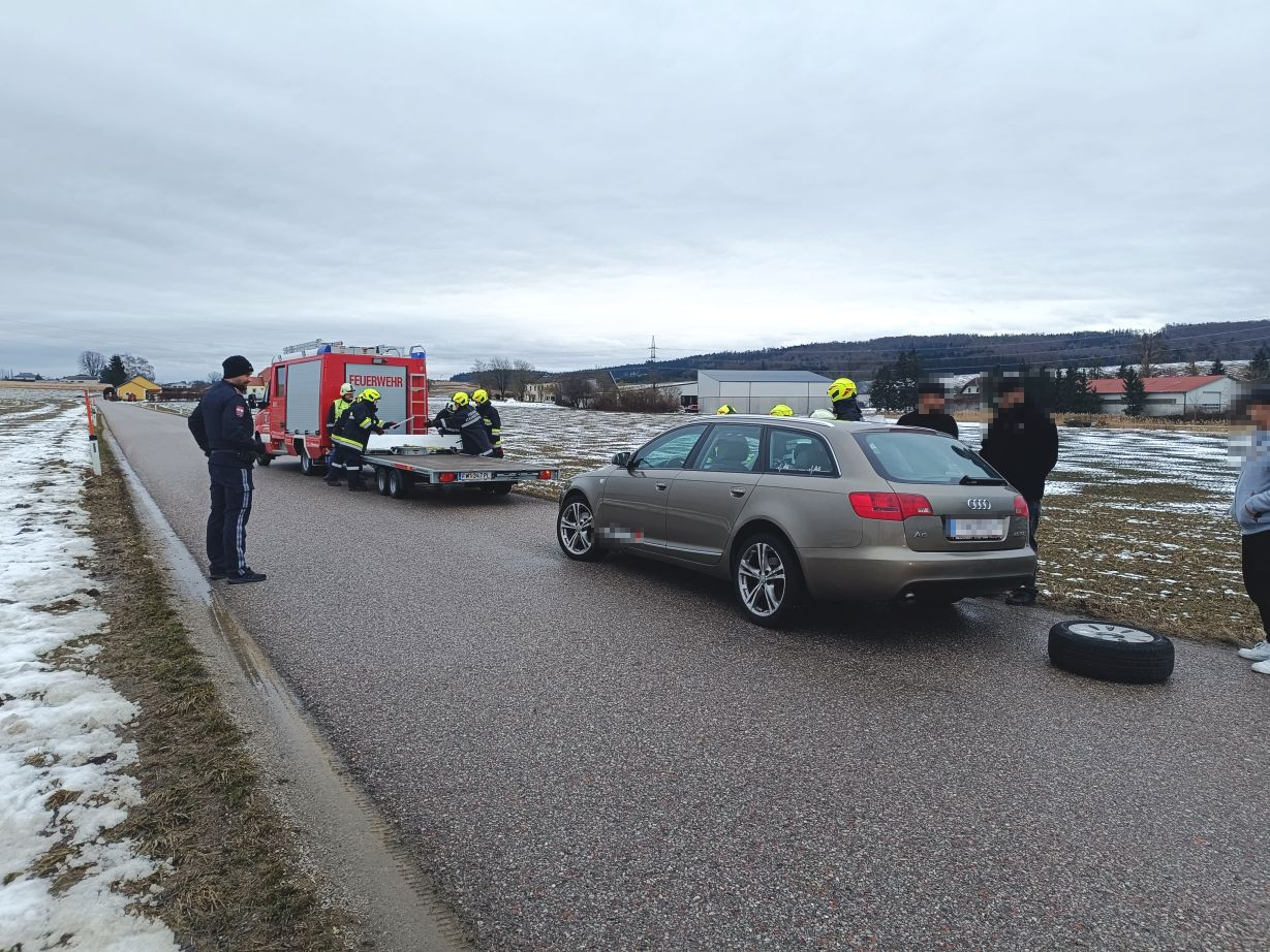 Am 22. Februar wurden wir zu einer PKW-Bergung alarmiert. Ein PKW verlor auf der Straße einen Reifen. Nach Absicherung der Unfallstelle und Freigabe durch die Polizei unterstützten wir den PKW-Lenker mit dem defekten Reifen. Anschließend konnten wir das Fahrzeug mittels Abschleppanhänger sicher abstellen.