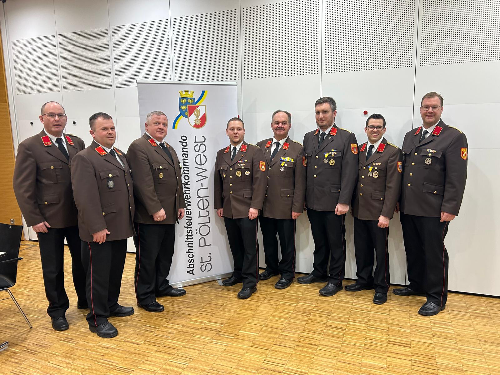 Foto von links nach rechts: OBI Christian Lechner (Kommandant FF Haindorf), OBI Markus Steinwendner (Kdt. FF Markersdorf), HBI Walter Diesmayr (Kdt FF St.Margarethen), BI Daniel Heimberger (Kdt.-Stv. FF Markersdorf), HBI Josef Anzenberger (Kdt. FF Haunoldstein), OBI Thomas Huber (Kdt.-Stv. FF Haunoldstein), BI Florian Holland (Kdt.-Stv. FF St.Margarethen), BI Michael Dutter (Kdt.-Stv. FF Haindorf)